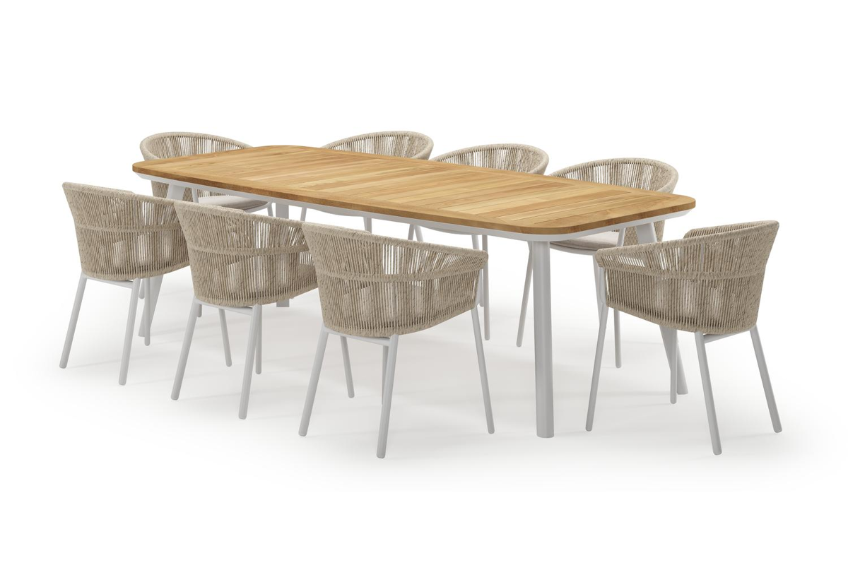 Mosa bootvormige tuinset in wit aluminium en teak natural finish met 8 Matera tuinstoelen | Exterioo