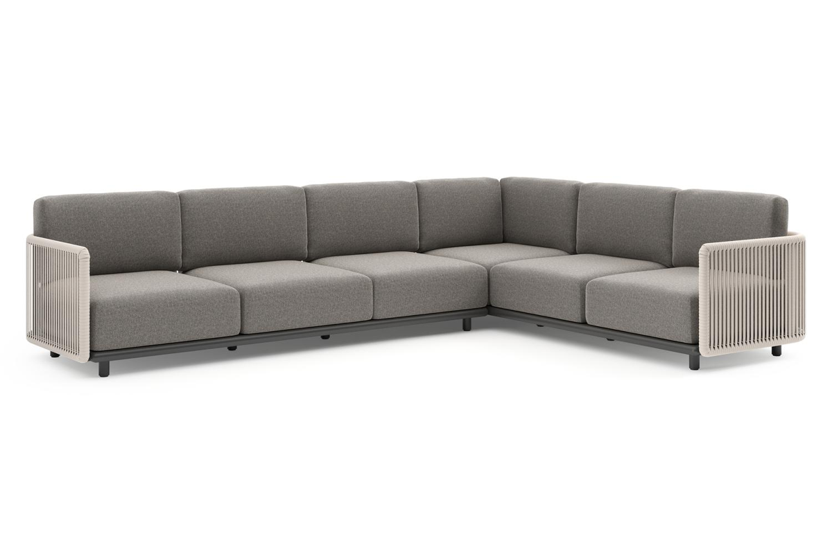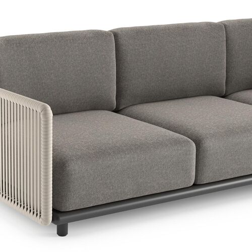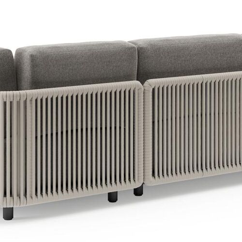Organo loungehoek in zwart aluminium en beige verticaal geweven luxe vlakke rope met chartres drizzle all weather Sunbrella® luxe kussen | Exterioo